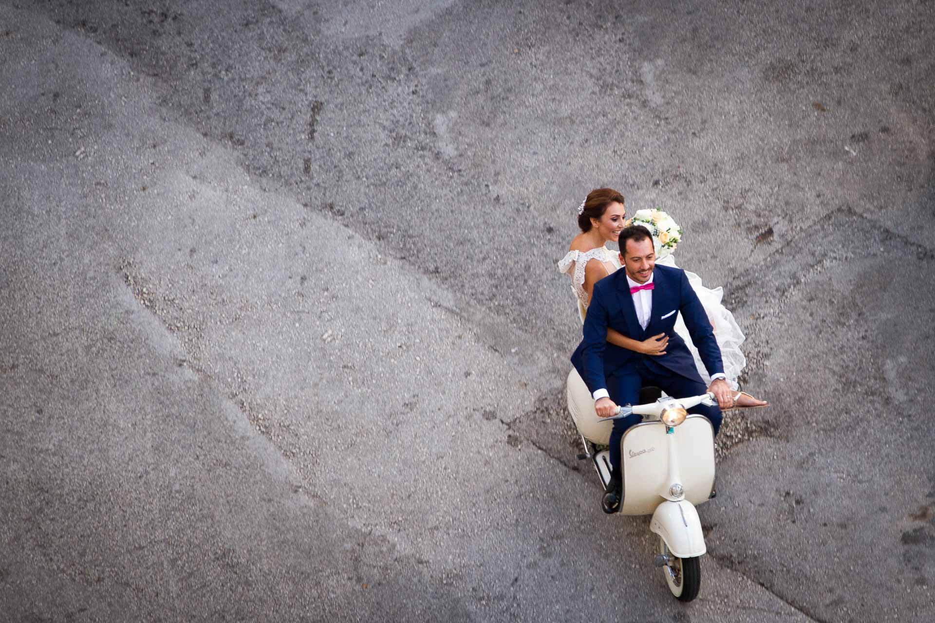 Από το γάμο αυτό δεν έλειψαν οι ξεχωριστές αλλά και αστείες στιγμές! Ο Michael με τον κουμπάρο είχαν κανονίσει να φτάσουν στην εκκλησία με μια παλιά νοικιασμένη Vespa… Όμως το σχέδιο τους είχε απρόοπτα! Η μηχανή ήταν τόσο παλιά που έσβηνε κάθε λίγα λεπτά, έτσι ο κουμπάρος έσπρωχνε σχεδόν τον Michael σε όλη τη διαδρομή μέχρι την εκκλησία! Η νύφη πάλι έφτασε στην εκκλησία περπατώντας σε πομπή με τους συγγενείς της μέσα από τα στενά της Κέρκυρας, αποσπώντας τα βλέμματα των περαστικών! Το μυστήριο τελέστηκε στην Καθολική Εκκλησία της Κέρκυρας και μετά οι καλεσμένοι επιβιβάστηκαν στο τουριστικό τρενάκι που τους περίμενε για να τους ξεναγήσει στην πόλη, ενώ το ζευγάρι κι εγώ κατευθυνθήκαμε προς το παλιό φρούριο για να βγάλουμε φωτογραφίες! Και οι δύο ήταν τόσο χαλαροί, τόσο αέρινοι… Η χαρά από τη μια πλευρά τους έκανε να πετούν στα σύννεφα, αλλά από την άλλη πλευρά και η διάθεσή τους για παιχνίδι ήταν πραγματικά αστείρευτη!
